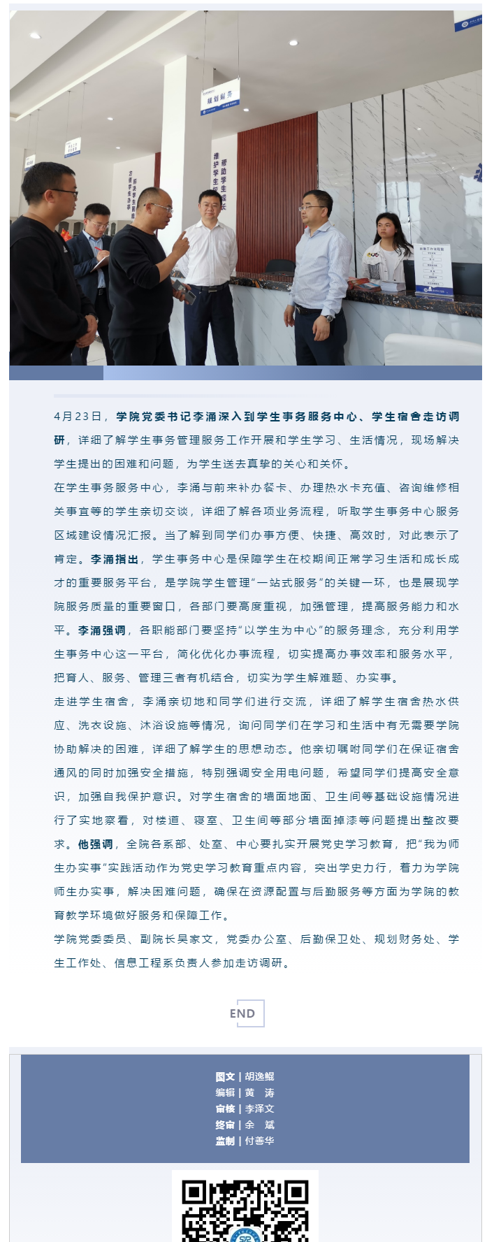 突出學(xué)史力行,為學(xué)生辦實事解難題 ——畢節(jié)工職院黨委書記李涌到學(xué)生事務(wù)服務(wù)中心、 學(xué)生宿舍走訪調(diào)研
