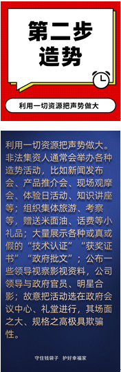 三是以虛假宣傳造勢。不法分子在宣傳上往往一擲千金,聘請明星代言、名人站臺,在各大廣播電視、網(wǎng)絡(luò)等媒體發(fā)布廣告、在著名報刊上刊登專訪文章、雇人廣為散發(fā)宣傳單、進行社會捐贈等方式,制造虛假聲勢。