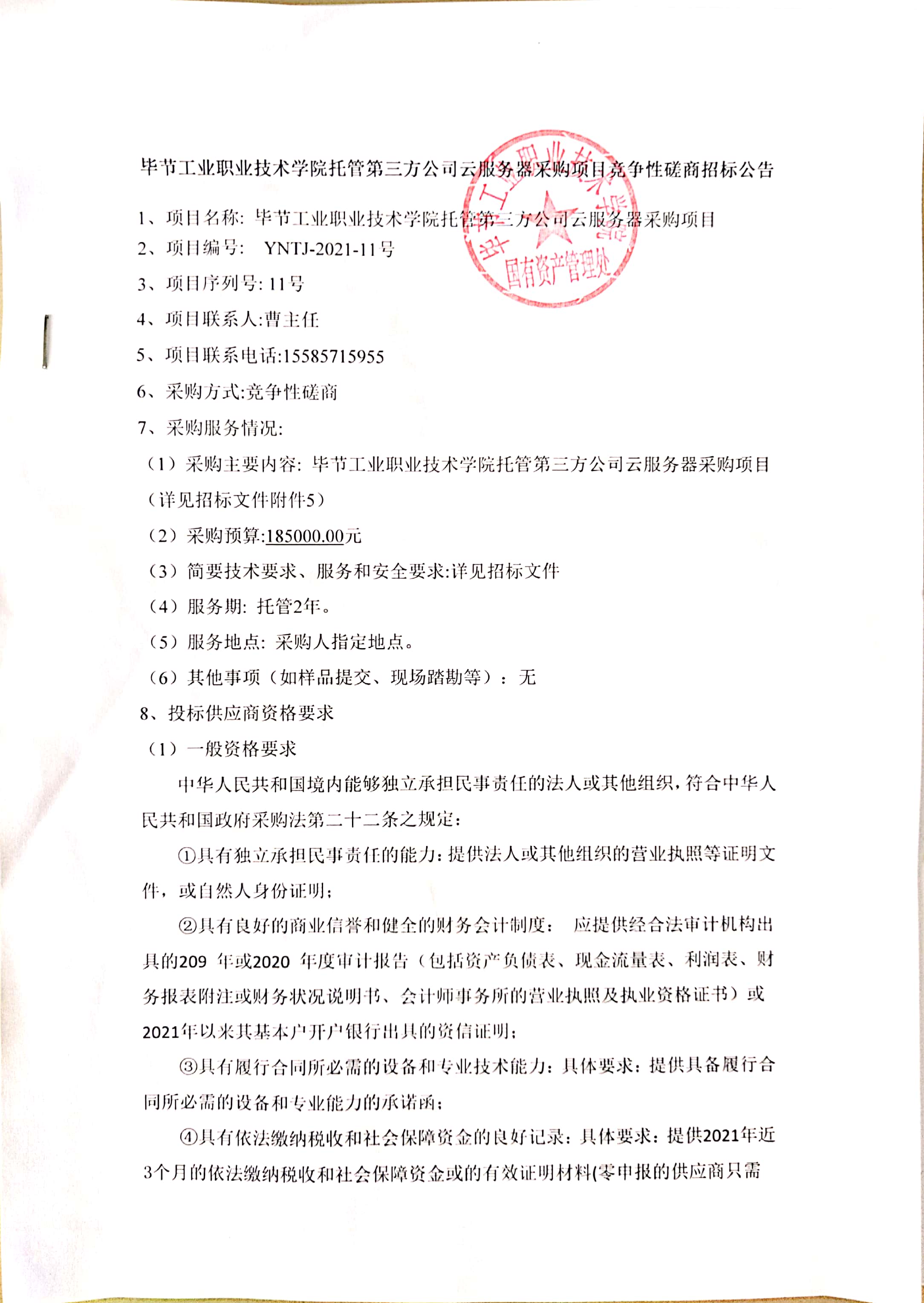 畢節(jié)工業(yè)職業(yè)技術(shù)學(xué)院托管第三方公司云服務(wù)器采購項目競爭性磋商招標(biāo)公告