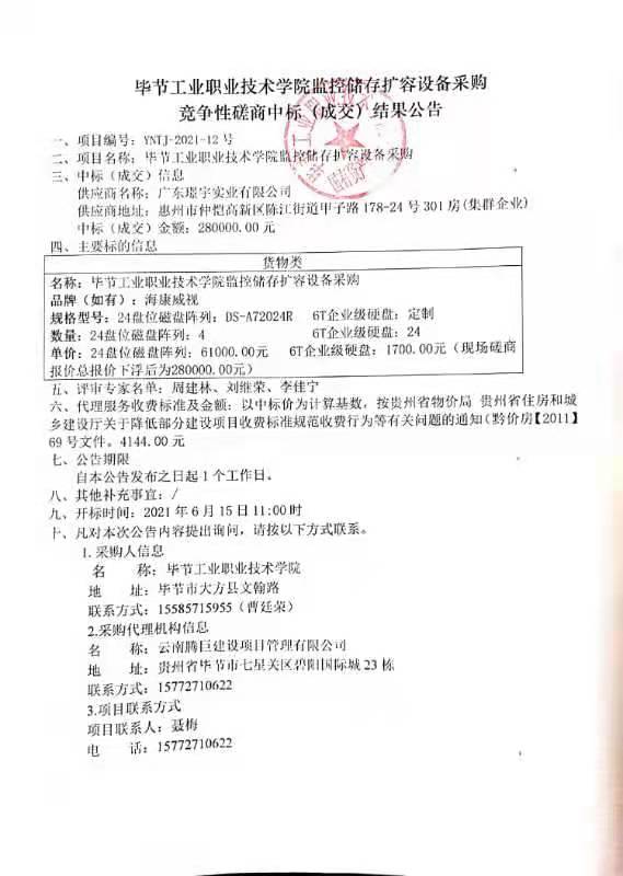 畢節(jié)工業(yè)職業(yè)技術學院監(jiān)控儲存擴容設備采購競爭性磋商中標(成交)結果公告
