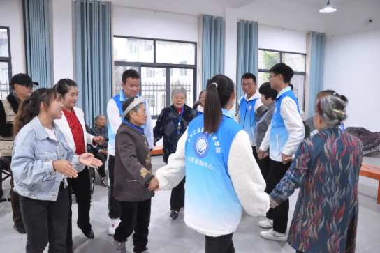揭牌儀式后,學院心理咨詢中心周靜、龍錦春、李玉菊三名老師,以及抽調的“團體心理輔導治愈力量"6名學生同老人們開展了一次團體輔導活動,活動專門為老年人設計,周全的顧慮到老年人的身心狀況,老人們在活動參與過程中分享了自己的心聲并參與了積極的談話。依托此次活動,心理咨詢中心的師生以積極心理學的原理激發(fā)了老人內心世界的正能量,以達到治愈的作用。隨后三位老師分別為有需要的老人提供一對一的心理輔導,聆聽他們的心聲,讓他們回味曾經(jīng)的驕傲,促進了老人健康向上的心態(tài),養(yǎng)老中心的老人們紛紛表示度過了一個愉快而富有意義的重陽節(jié)。