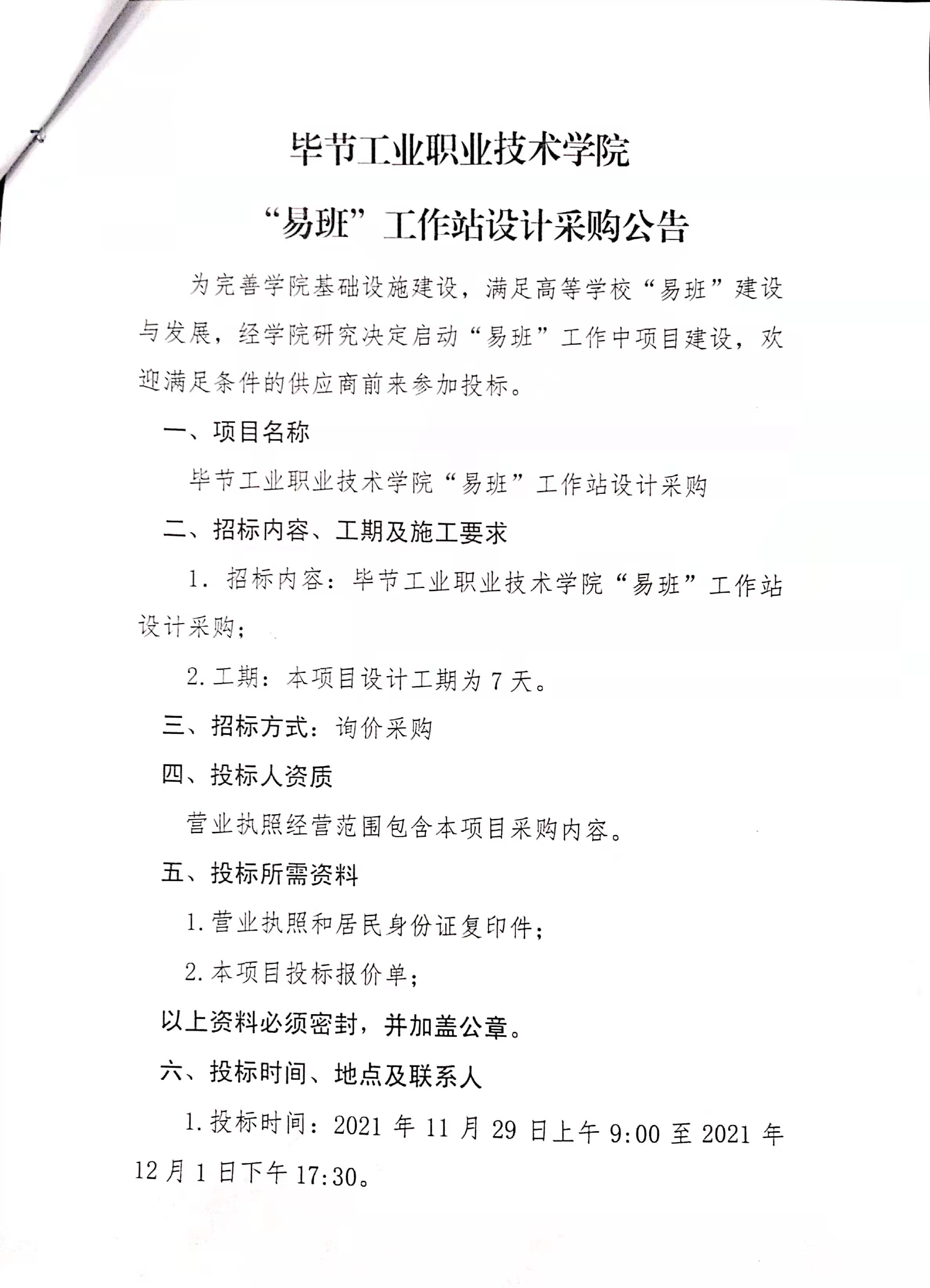 畢節(jié)工業(yè)職業(yè)技術(shù)學(xué)院“易班”工作站設(shè)計采購公告