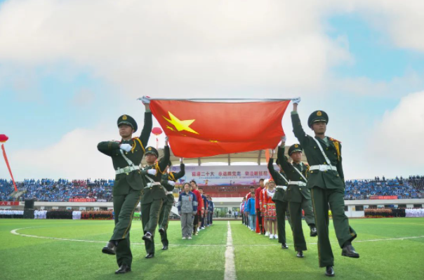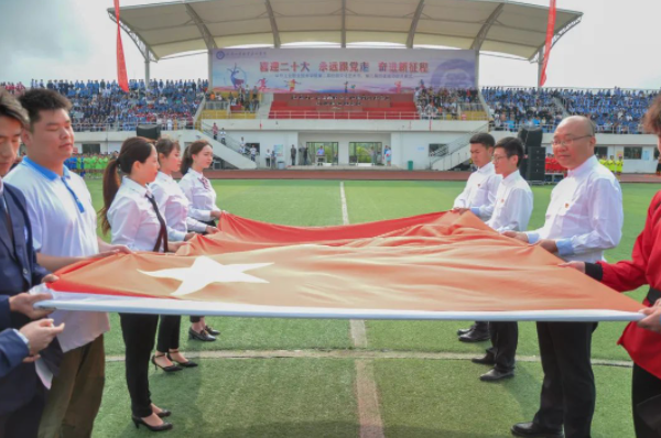 隨著《歌唱祖國》的樂曲響起,開幕式正式開始,學(xué)院代表教師和學(xué)生手手傳遞著五星紅旗,交到國旗護(hù)衛(wèi)隊(duì)手中,這是一種傳承,更是一份責(zé)任,一份擔(dān)當(dāng)。緊接著,雄壯的國歌響起,鮮艷的五星紅旗升起在田徑場上空。
