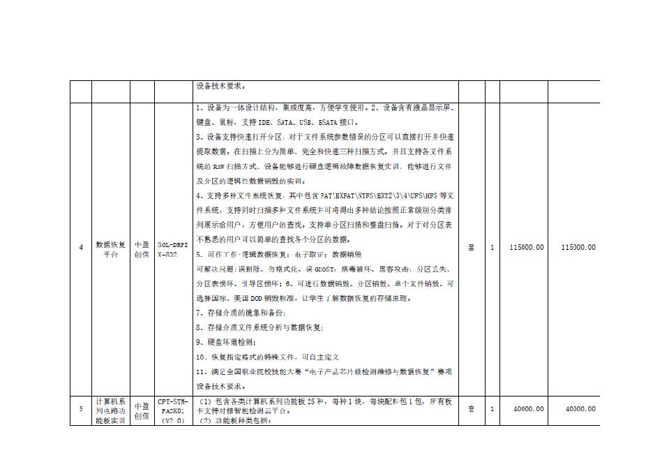 標的名稱:計算機硬件檢測及數據恢復實訓、技能大賽設備購置 品牌:詳見附件。 規(guī)格型號:詳見附件。 數量:詳見附件 單價:詳見附件(此單價為中標供應商的基礎報價) 服務要求:按國家現(xiàn)行的相關規(guī)范、標準以及采購項目的實際需求20日歷天完成本項目的供貨及安裝等要求,符合采購人使用要求。 |
