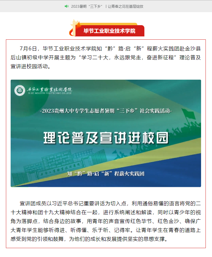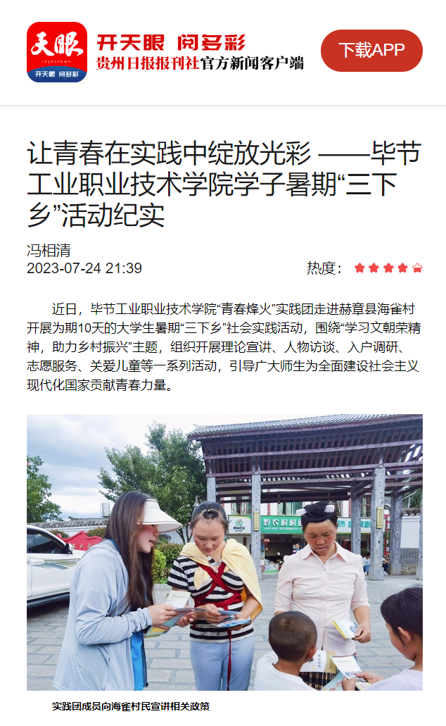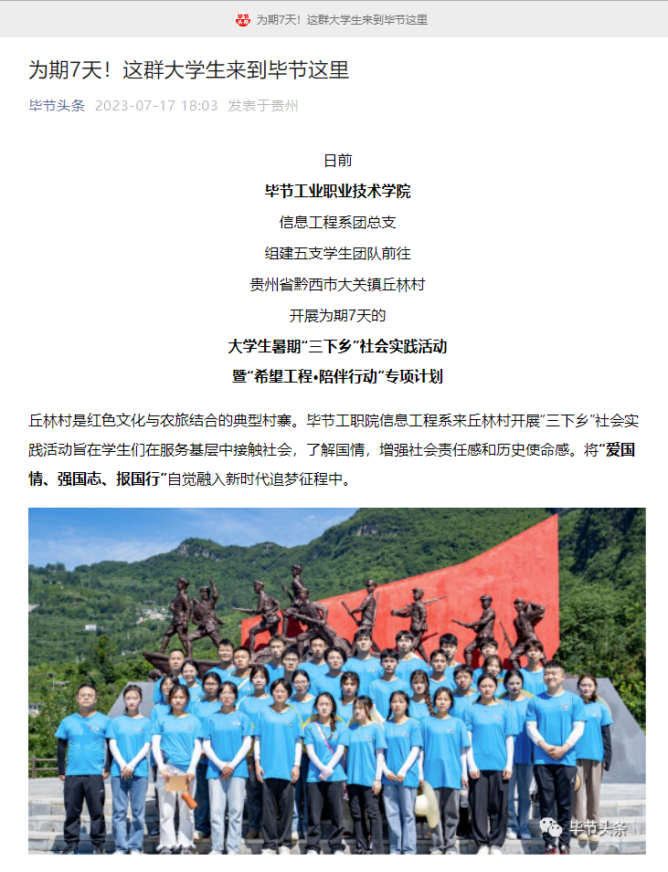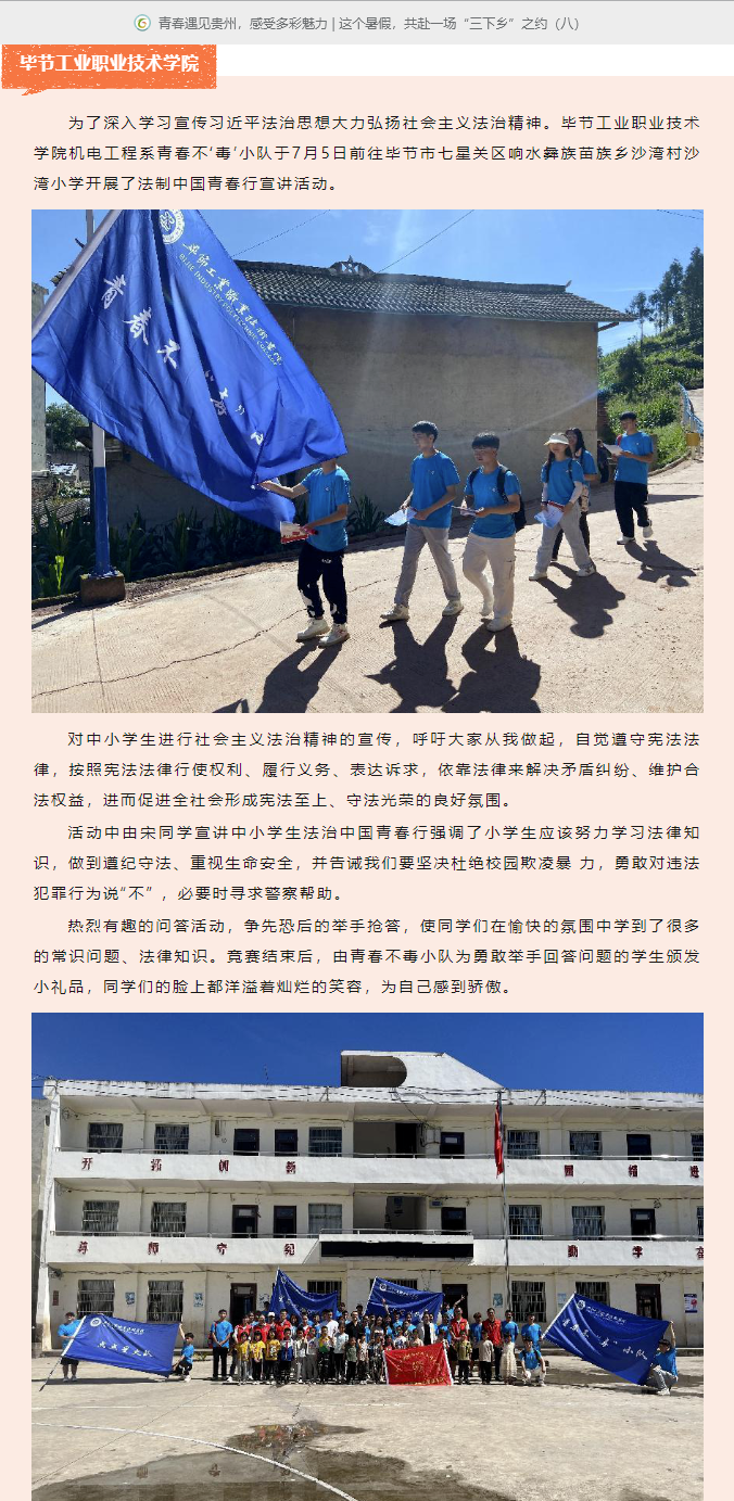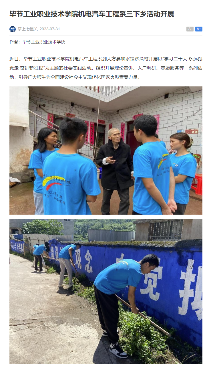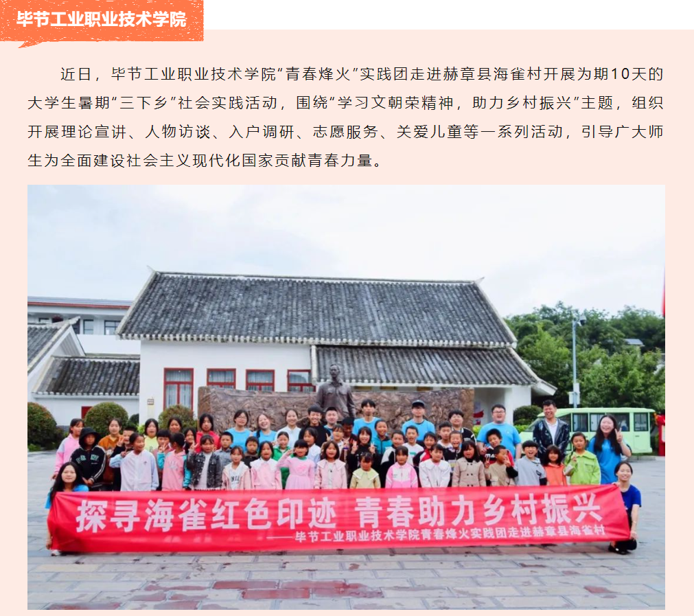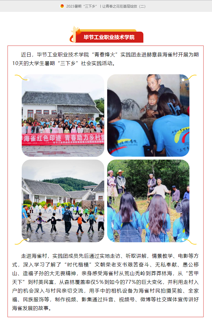 在我院今年暑期“三下鄉(xiāng)”社會實(shí)踐活動(dòng)中,22支實(shí)踐隊(duì)走進(jìn)基層、社區(qū)、農(nóng)村,精心開展主題鮮明、形式多樣、有內(nèi)涵、有質(zhì)量的實(shí)踐活動(dòng),足跡遍布黔東南州榕江縣兩汪鄉(xiāng)、畢節(jié)市赫章縣海雀村、黔西市大關(guān)鎮(zhèn)丘林村、金沙縣后山鎮(zhèn),七星關(guān)區(qū)陰底鄉(xiāng)羅雄村、先鋒村等地,選題覆蓋了黨史學(xué)習(xí)教育、鄉(xiāng)村振興、優(yōu)秀傳統(tǒng)文化傳承、理論宣講、教育關(guān)愛、成就觀察等多個(gè)方面。自暑期“三下鄉(xiāng)”社會實(shí)踐活動(dòng)啟動(dòng)以來,受到多家主流媒體的廣泛關(guān)注和報(bào)道,社會實(shí)踐工作的影響力顯著增強(qiáng)。
