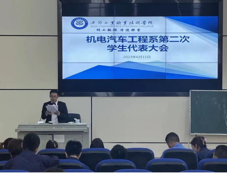 2023年6月15日,畢節(jié)工業(yè)職業(yè)技術學院機電汽車工程系第二次學生代表大會在括海學院二樓會議室召開。第一階段,到會的領導及嘉賓一同奏唱國歌,機電工程系負責人張建為大會致開幕詞,院團委負責人伍紹平老師宣讀了團委批復,系部黨總支張禾書記宣讀黨總支批復,宣讀完畢后到會領導及嘉賓進行了合影留戀。