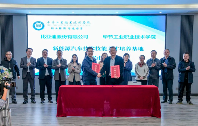 11月10日,畢節(jié)工業(yè)職業(yè)技術(shù)學(xué)院與比亞迪汽車(chē)股份有限公司、行云新能科技(深圳)有限公司開(kāi)展“比亞迪新能源汽車(chē)技術(shù)技能人才培養(yǎng)基地”簽約儀式。學(xué)院黨委副書(shū)記、院長(zhǎng)邱國(guó)援,畢節(jié)市教育局黨組成員、副局長(zhǎng)金莉,比亞迪西南地區(qū)人力資源總監(jiān)蔣平,行云新能科技(深圳)有限公司副總經(jīng)理王克靜出席儀式。學(xué)院、比亞迪、行云新能相關(guān)領(lǐng)導(dǎo)及學(xué)院汽車(chē)工程系師生代表參加儀式。儀式由學(xué)院黨委委員、副院長(zhǎng)吳家文主持。