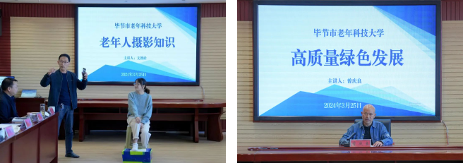 3月25日,“畢節(jié)市老年科技大學(xué)”掛牌儀式在畢節(jié)工業(yè)職業(yè)技術(shù)學(xué)院舉行。貴州省老科學(xué)技術(shù)工作者協(xié)會(huì)副會(huì)長(zhǎng)、畢節(jié)市老科學(xué)技術(shù)工作者協(xié)會(huì)會(huì)長(zhǎng)李克明,貴州省老科學(xué)技術(shù)工作者協(xié)會(huì)科學(xué)普及與教育專門委員會(huì)委員、畢節(jié)市老科協(xié)副會(huì)長(zhǎng)、畢節(jié)市老年科技大學(xué)校長(zhǎng)李瓊,畢節(jié)市科學(xué)技術(shù)協(xié)會(huì)副主席羅麗;學(xué)院黨委書記李涌,黨委副書記、院長(zhǎng)邱國(guó)援出席儀式,學(xué)院領(lǐng)導(dǎo)班子成員及相關(guān)部門負(fù)責(zé)人20余人參加儀式。儀式由李瓊主持。 李克明在會(huì)上表示,掛牌成立畢節(jié)市老年科技大學(xué)是提升我市老年人科學(xué)素質(zhì),切實(shí)有力推動(dòng)科技為民服務(wù)的客觀需要,標(biāo)志著我市科技教育和老年教育的融合發(fā)展,開啟了我市對(duì)老年人開展繼續(xù)教育和科普培訓(xùn)的新征程。老年科技大學(xué)要堅(jiān)持以提升老年人的科學(xué)素養(yǎng)、健康素質(zhì)、數(shù)字技能等為目標(biāo),進(jìn)一步擴(kuò)大老年教育資源供給,助力科學(xué)普及,推動(dòng)科技為民服務(wù),為建設(shè)新發(fā)展理念示范區(qū)、譜寫中國(guó)式現(xiàn)代化畢節(jié)實(shí)踐新篇章貢獻(xiàn)智慧和力量。 授牌儀式結(jié)束后,市老年科技大學(xué)副校長(zhǎng)文勁松、市老科學(xué)技術(shù)工作者協(xié)會(huì)智庫專家曾慶良分別開展了《老年人攝影知識(shí)》和《高質(zhì)量綠色發(fā)展》現(xiàn)場(chǎng)授課。