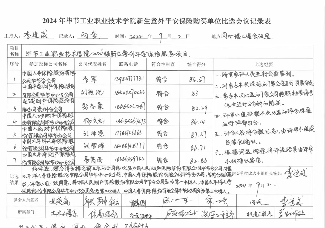 畢節(jié)工業(yè)職業(yè)技術(shù)學院2024級新生意外平安保險服務項目比選結(jié)果公告
