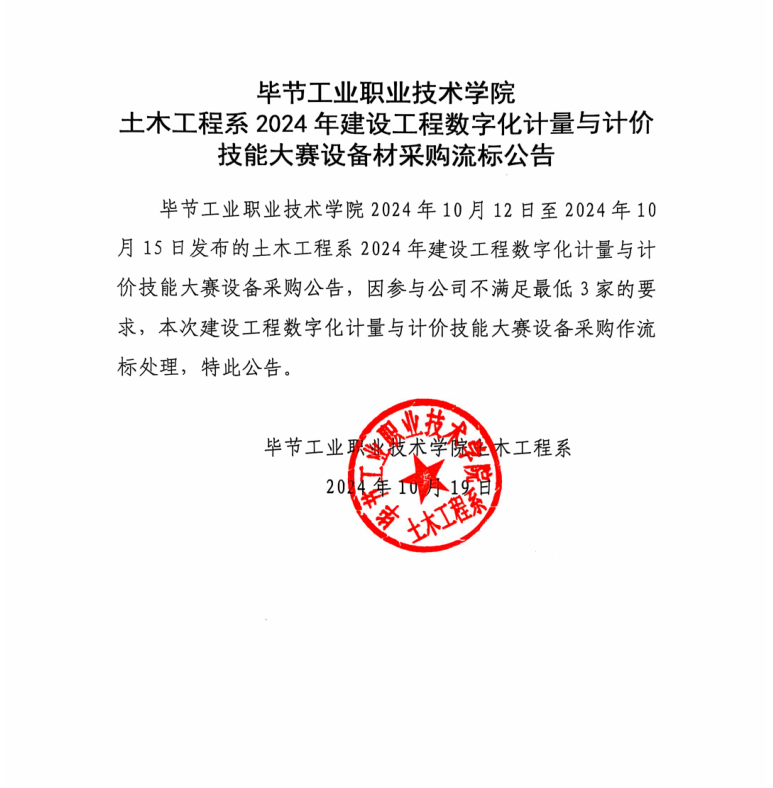 畢節(jié)工業(yè)職業(yè)技術(shù)學(xué)院土木工程系2024年建設(shè)工程數(shù)字化計量與計價技能大賽設(shè)備耗材采購流標(biāo)公告