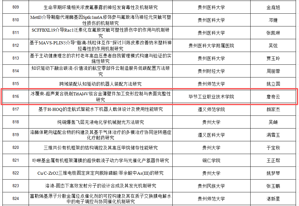 近日,貴州省科學(xué)技術(shù)廳公布了《2026年貴州省基礎(chǔ)研究計(jì)劃面上、重點(diǎn)項(xiàng)目擬立項(xiàng)項(xiàng)目公示》。我系詹奇云老師主持申報(bào)的項(xiàng)目《冰覆束—超聲復(fù)合銑削 Ti6Al4V 鈦合金薄壁件加工變形控制與表面完整性研究》成功入選,擬獲2026年貴州省基礎(chǔ)研究計(jì)劃面上項(xiàng)目立項(xiàng),充分彰顯了我院在基礎(chǔ)研究領(lǐng)域持續(xù)提升的科研實(shí)力與良好發(fā)展態(tài)勢(shì)。