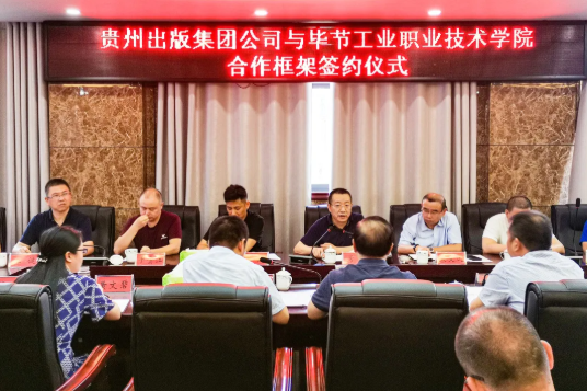 7月24日早上,我院與貴州出版集團公司在同心樓三樓會議室簽署合作框架協(xié)議。貴州出版集團公司黨委副書記常勇,貴州省新華書店有限公司黨委副書記、總經(jīng)理李健,畢節(jié)市新華書店有限公司總經(jīng)理王健,六盤水市新華書店有限公司總經(jīng)理鐘子杰,畢節(jié)工業(yè)職業(yè)技術(shù)學院黨委副書記、院長邱國援,黨委副書記付善華,黨委委員、副院長吳家文,黃河,黃文碧及相關(guān)部門負責人出席儀式。簽約儀式由吳家文主持。